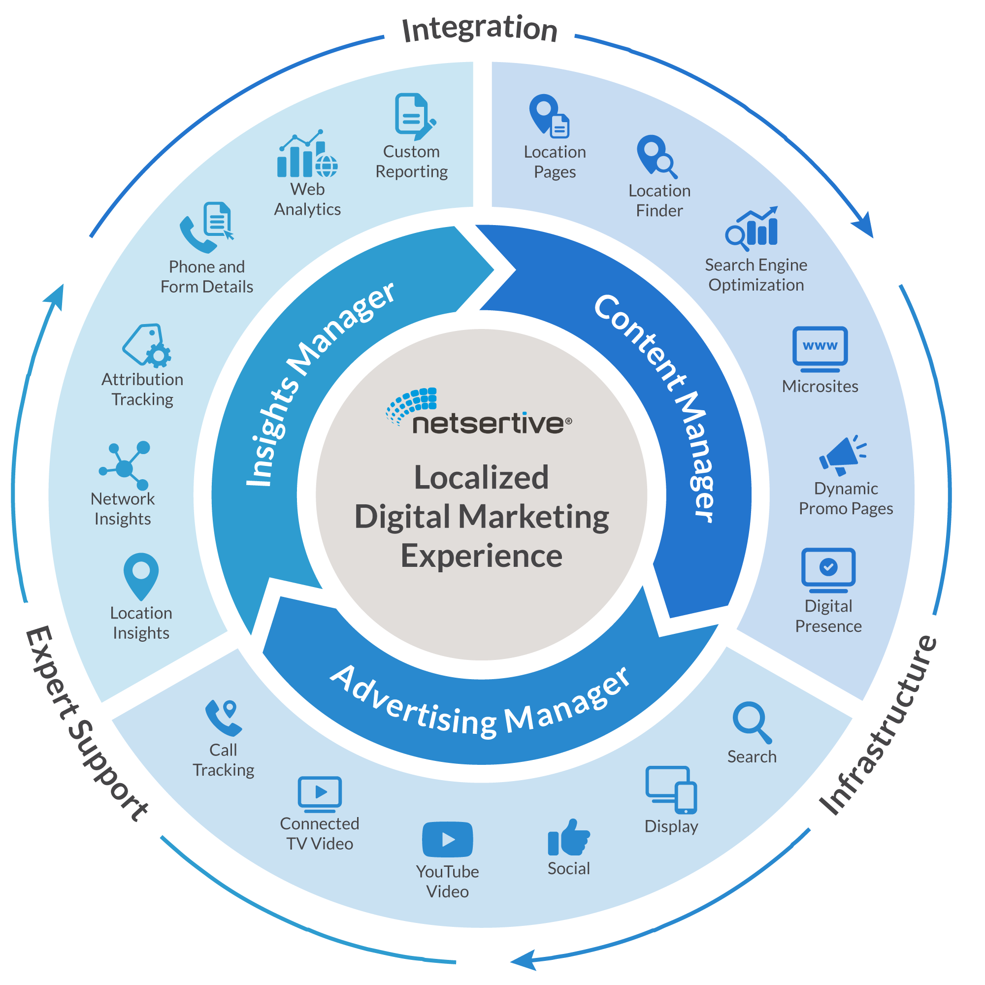 Netsertive manages multi-channel campaigns on our platform that combines search, social, video, and display advertising with the unique ability to personalize ads by location.
